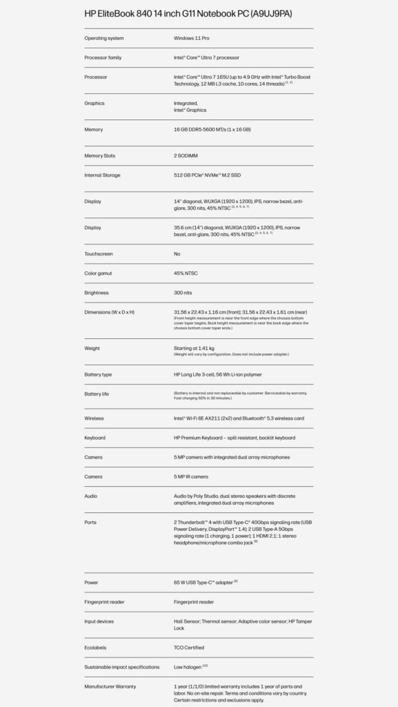 HP EliteBook 840 G11 Laptop 1ntel® Core™ Ultra 7 Processor 165U (12M Cache, up to 4.90 GHz) -16 GB DDR5-512 GB Nvme SSD-13″ (1920 x 1200), IPS WUXGA display-Windows 11 Pro