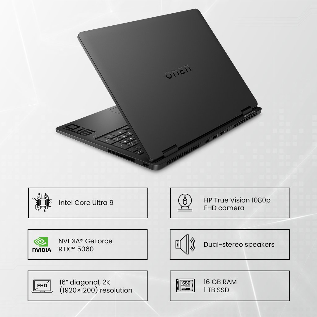 HP Omen Slim 16-AN008TX Gaming Laptop with 16" FHD Display, Intel Core Ultra 9-285H Processor, 16GB RAM, 1TB SSD, NVIDIA GeForce RTX 5060 8GB, Windows 11 Pro, Microsoft Office Professional Lifetime Activated, Bluetooth, Shadow Black