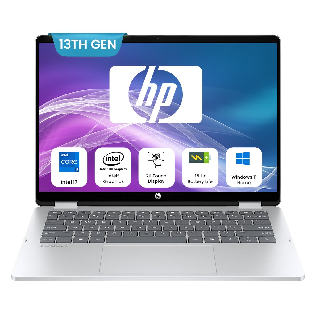 HP OmniBook 5 Flip Laptop, 14" 2K IPS Touch Display, Intel Core 7 Series 1 Processor, 16GB RAM, 512GB SSD, Intel Graphics, English keyboard, Windows 11 Home, Glacier Silver | B86Q7UA#ABA