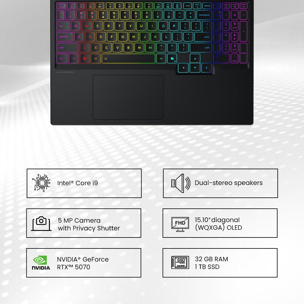 15.1″ WQXGA OLED Display | Intel Core i9-14900HX Processor | 32GB RAM | 1TB SSD | NVIDIA GeForce RTX 5070 | Windows 11 Pro | Microsoft Office Professional Lifetime | Eclipse Black